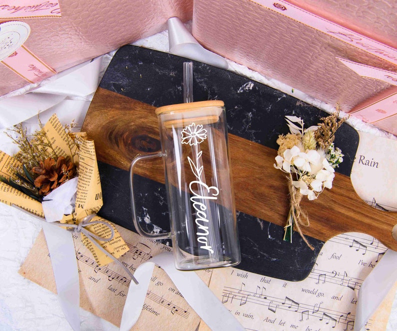 Personalised Birth Flower Tumbler, Transparent Water Cup with Handle and Straw, Bridesmaid Gift, Mothers Day Gift, Office Gift, Gift for Her